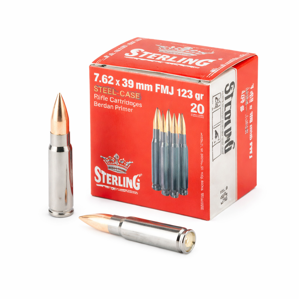 The Sterling 7.62x39mm Full Metal Jacket (FMJ) 123 Grain ammunition is engineered for shooters who demand reliability and consistent performance. Manufactured with precision, this steel-cased ammo delivers smooth feeding, dependable ignition, and solid accuracy.